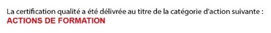 Organisme de formation déclaré auprès de la préfecture et de la DIRECCTE OCCITANIE (DREETS), elle est également certifiée QUALIOPI, ouvrant la possibilité d'une prise en charge, selon les conditions fixées par chaque organisme, des frais engagés dans le cadre des formations qu'elle dispense.
